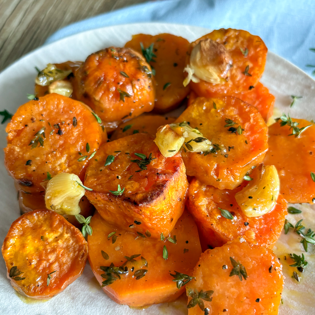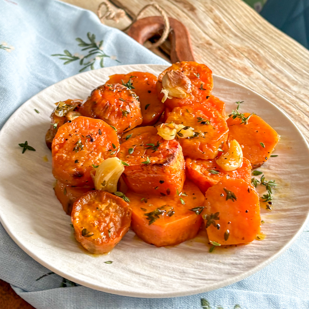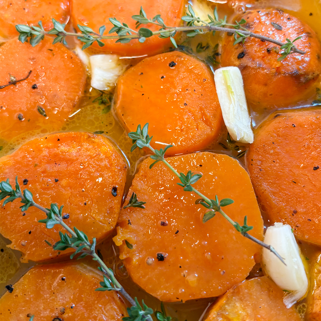 Melting Sweet Potatoes are roasted sweet potato rounds finished in aromatic broth with garlic and rosemary. The method combines high-heat roasting and gentle braising to create a buttery interior and golden exterior. Serve as a refined yet simple side dish for roast dinners or seasonal meals.