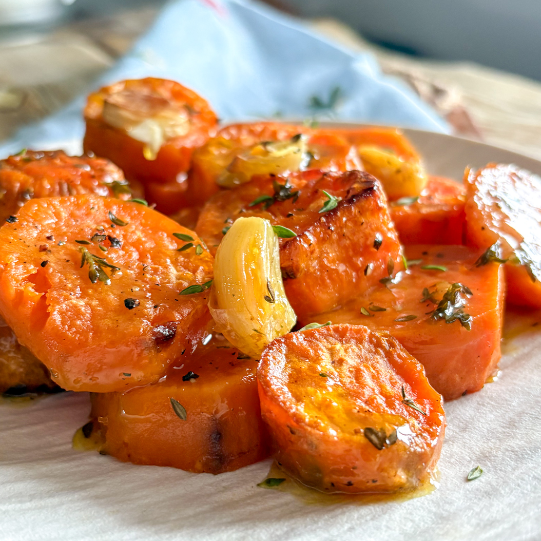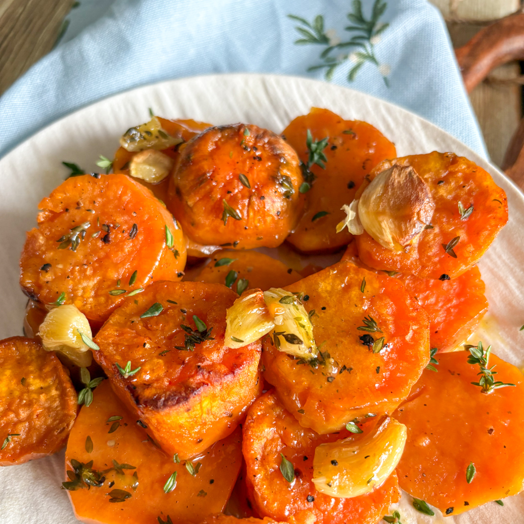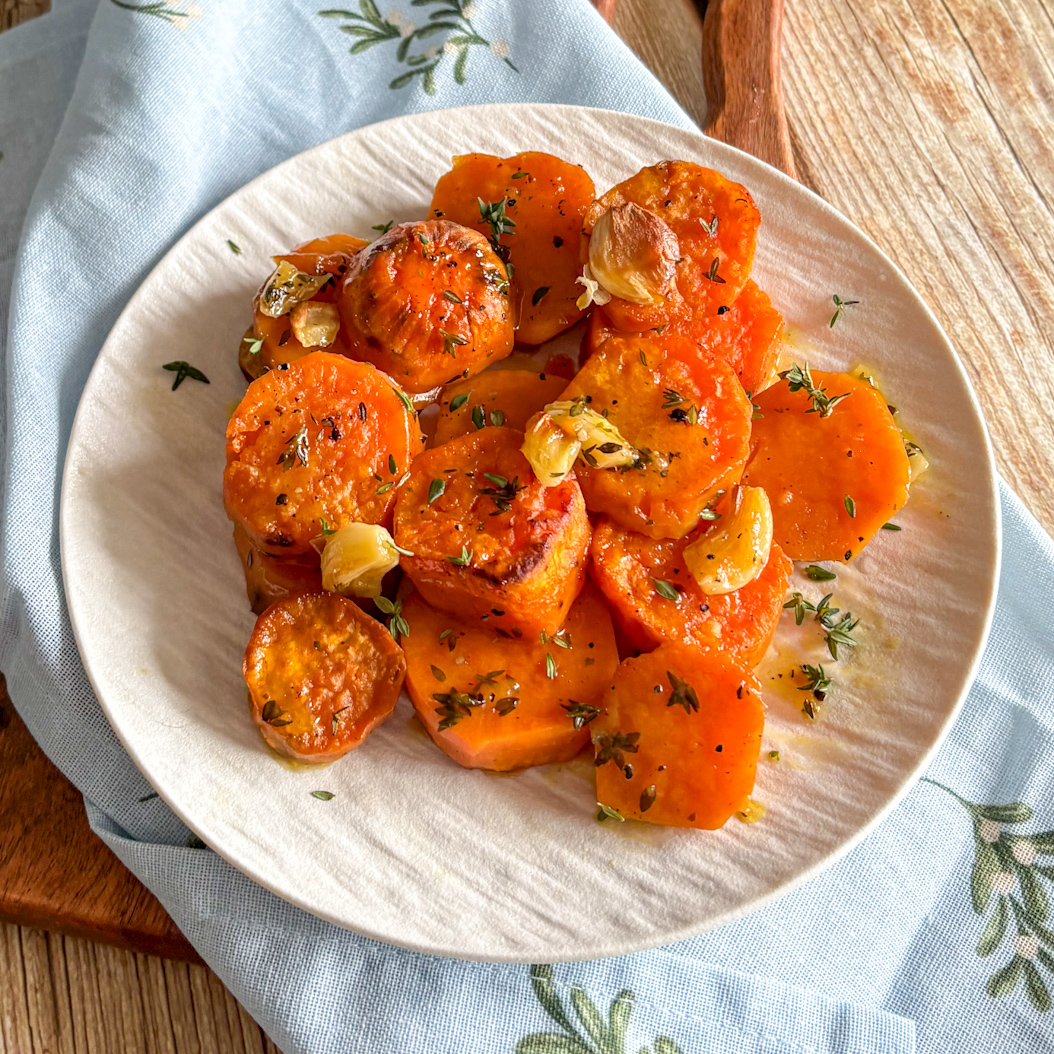 Melting Sweet Potatoes are roasted sweet potato rounds finished in aromatic broth with garlic and rosemary. The method combines high-heat roasting and gentle braising to create a buttery interior and golden exterior. Serve as a refined yet simple side dish for roast dinners or seasonal meals.