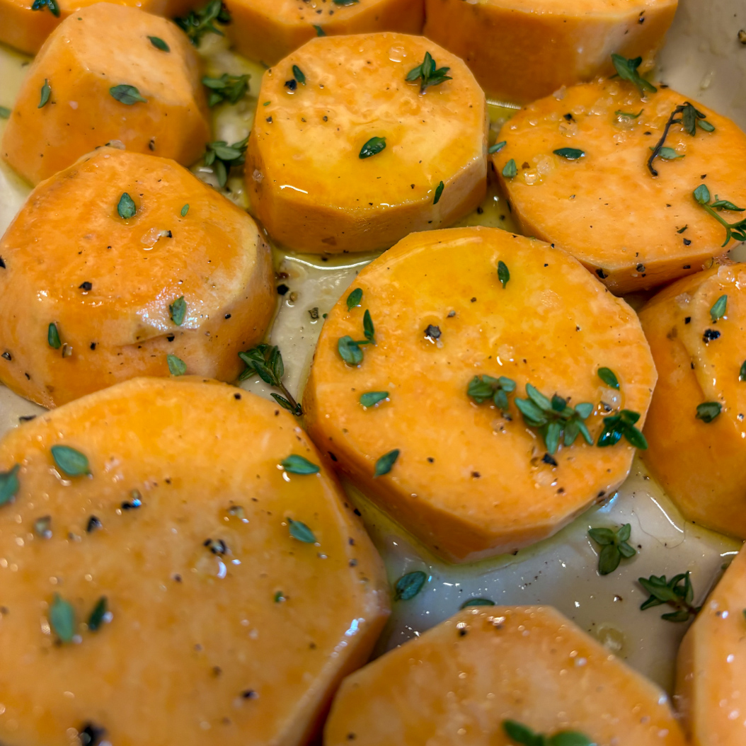 - Step 2: Melt the unsalted butter completely. Pour the melted butter over the sweet potato rounds, then add the olive oil, chopped rosemary, a pinch of kosher salt and several turns of freshly ground black pepper. Toss thoroughly so every round is evenly coated in the butter and oil mixture. Arrange the slices in a single layer in a high-sided baking dish, ensuring they do not overlap. Place the dish in the oven and roast for 15 minutes. Remove the dish, turn each round carefully using tongs or a spatula, and return it to the oven for another 10 minutes. This stage develops a deep golden colour, lightly crisp edges and concentrated sweetness before adding any liquid.