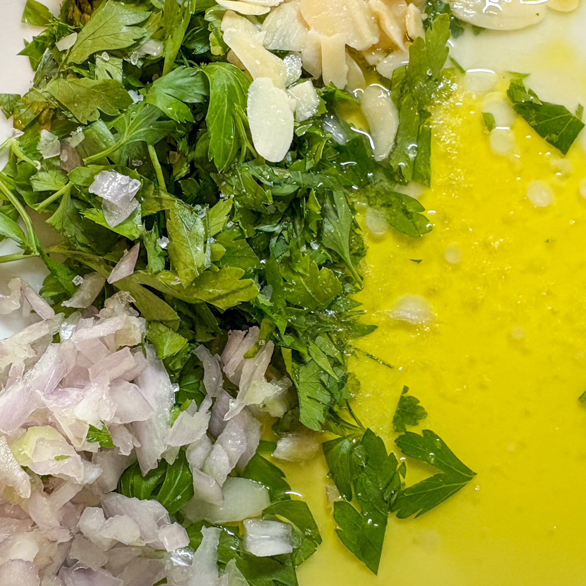 - Step 3: In a large bowl, combine chopped parsley, shallot, flaked almonds, olive oil, lemon juice, salt, and a drizzle of honey. Mix well. In a separate bowl, whisk together sour cream and horseradish, adjusting the heat to your taste.