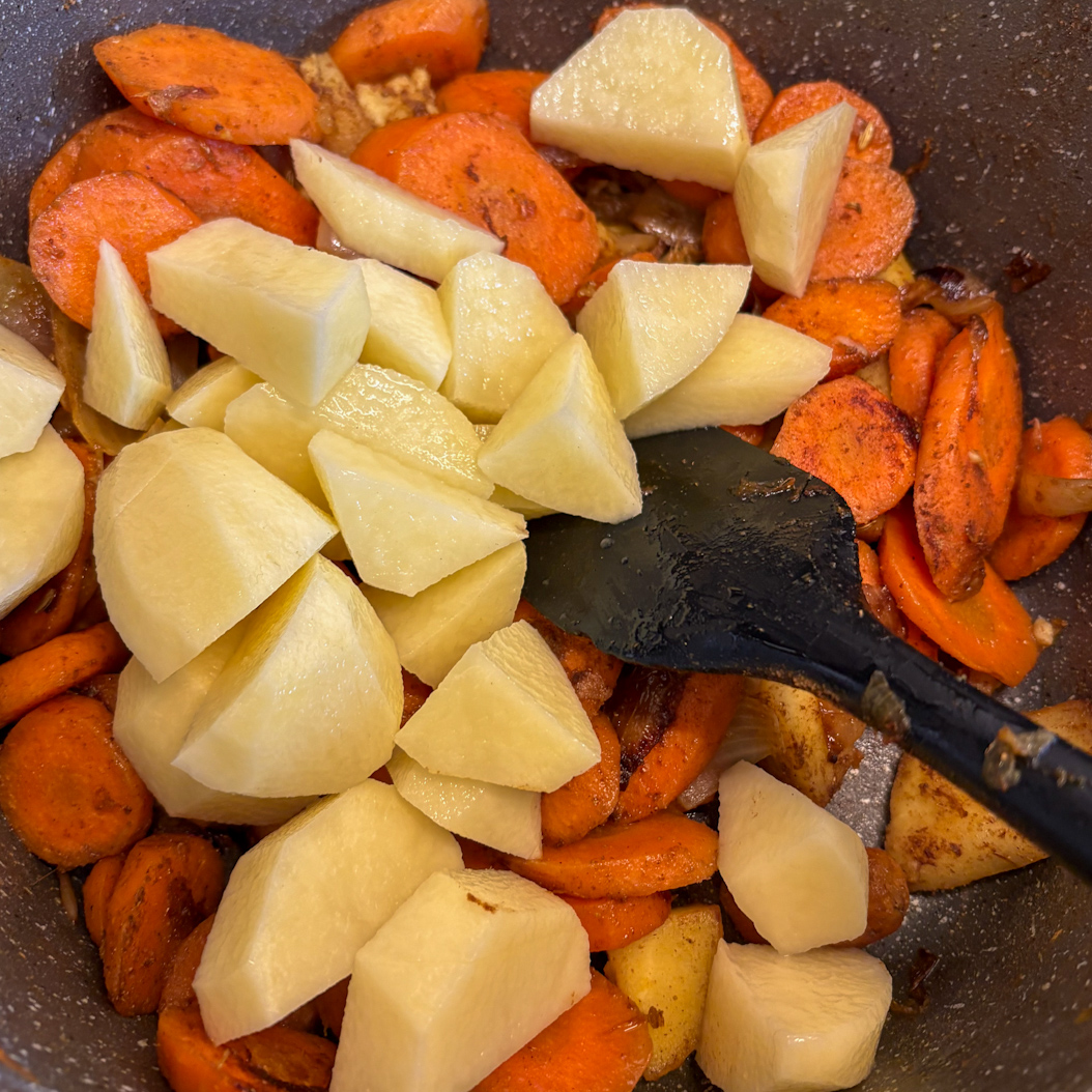 - Add the cubed potatoes and pour in enough stock to reach your preferred consistency. Bring to a gentle boil, cover with a lid, reduce the heat and simmer for 20–25 minutes until all vegetables are fully soft.