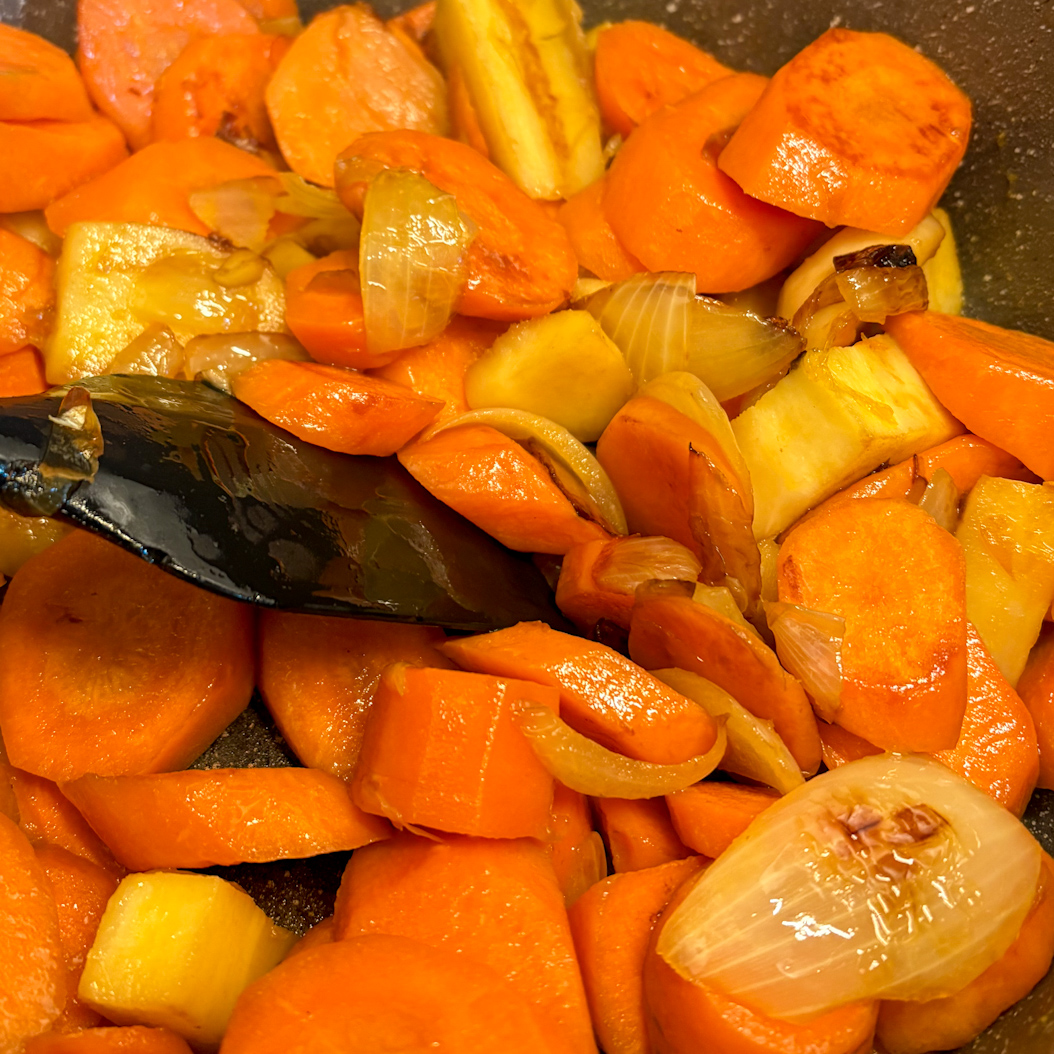 - Step 1: Prepare all ingredients. Sauté the onions, parsnip and carrots in a large pot for 10–15 minutes until the carrots begin to caramelise. I choose sautéing over roasting because you still achieve deep flavour while keeping everything in one pot.