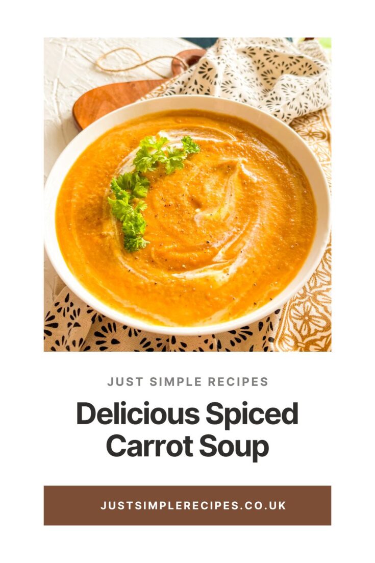 Serve spiced carrot soup hot with crusty bread or flatbread brushed lightly with butter for extra richness. A small swirl of cream or yoghurt adds contrast, and toasted seeds bring texture. If you prefer something more substantial, pair it with a simple salad or roasted sweet potato wedges.